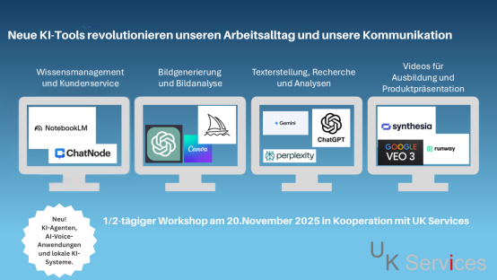 In einem halbtägigen Workshop stellt Ulrich Kramer, Inhaber unseres Mitgliedsunternehmens UK Services UG, diese und viele weitere (teilweise kostenlosen) Tools vor. Die neueste Generation der KI-Anwendungen eröffnet völlig neue Marktchancen und sorgt andererseits für eine deutliche Entlastung des Personals.